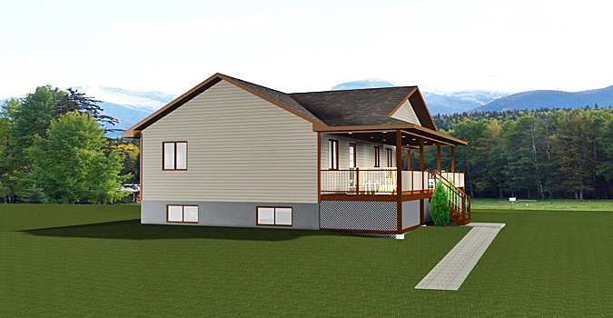 From the front door you enter into the great room, kitchen, and dinette, which has a vaulted ceiling over all three rooms. This open space concept makes this bungalow look very roomy. The L-shaped corner kitchen has an island with an eating bar. There are two bedrooms on this floor as well as a 3-piece bath. The deck on the front wraps around the side and can also be accessed by a door in the hallway across from the bathroom. The downstairs is finished with a huge recreation room, two more bedrooms, and another 3-piece bathroom. Laundry is located on this floor in the mechanical room. A great plan for a narrow lot in town or for a lot at the lake.