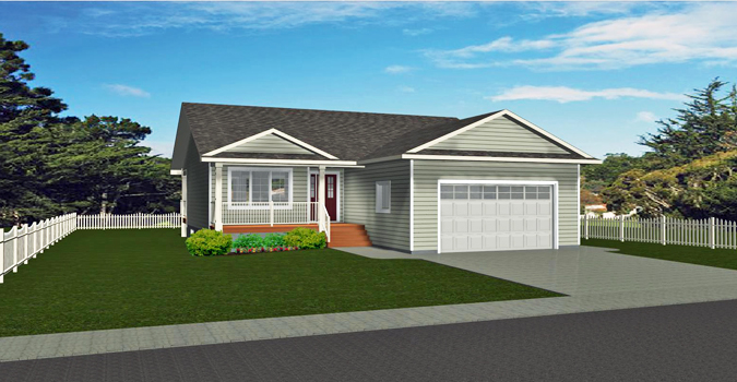 The front covered veranda gives this home a nice appeal. A small foyer leads to the open concept kitchen, dining room and great room area, which is vaulted. Double garden doors lead from the dining room to the rear partially covered deck. Down the hall you go past the laundry room to get to the bedrooms. There is also access from the garage through the laundry room. The stairs to the basement are right across from the laundry room. There are 2 bedrooms on the main floor. The master has a walk-in-closet and 3 piece ensuite. The garage has a 16'x8' door and a man door on the side. A basic bungalow plan that would fit on most town lots.