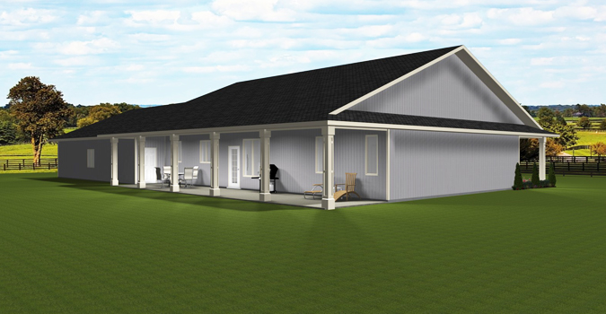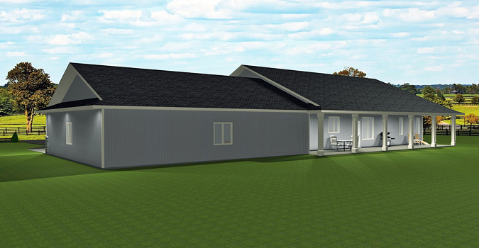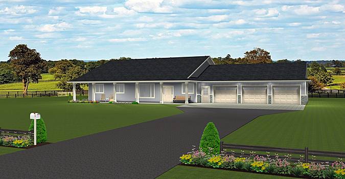 A well laid out home with everything that a country home owner would want. This plan is built with a slab on a 4' concrete foundation, so absolutely no stairs. The covered front and rear patios feature craftsman style posts. An oversized garage with three 10'x8' doors leaves lots of room for a workshop area. There is a man door in the front and in the rear off the patio. The mud room is off the laundry room which includes a two-piece bath. Also enter the kitchen via the large walk through pantry. The kitchen, with a working island and lunch counter, is open to the dining room and great room. Access the covered rear patio from the dining room through a French door. There is a storage room just off the front foyer. A three-piece bath is located next to the two bedrooms. The master bedroom features a large walk-in closet and a five-piece ensuite which includes a 48" walk-in shower and corner jetted tub. This home plan has everything on one level!