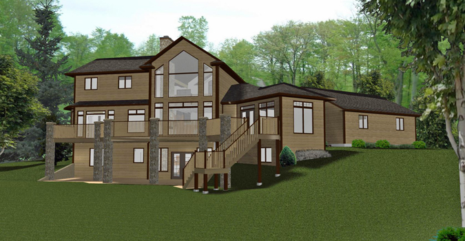 With spectacular features designed into each room, this luxurious home plan is meant to impress. The back wall of the great room is mostly glass from the floor to the vaulted ceiling on the second floor. A stone fireplace creates a balance against the tall walls. The kitchen features a walk-through pantry and a curved island. The den features french doors leading in. The master suite has a large walk-in closet, double garden doors onto the rear deck, and a deluxe ensuite with two sinks, a walk-in shower, and a step-up Whirlpool tub. The second floor features 2 nice sized bedrooms, each with a walk-in closet. The sitting area enjoys the same rear view as the great room. A railing separates the sitting room from the great room below. In the walk-out level, there are 2 more bedrooms, a large 3-piece bath, mechanical room, large storage area, and family room which features a fireplace and a wet bar. Two large windows and a double garden door lead out to a covered patio.