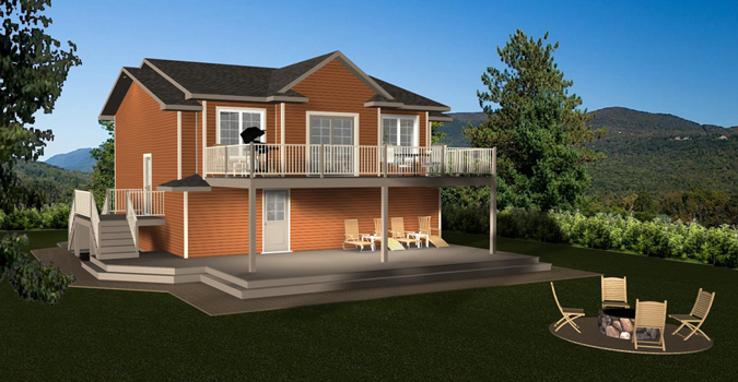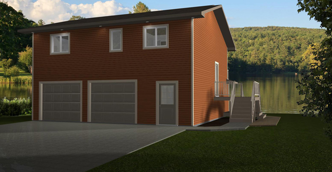 Enjoy this 2-storey cabin plan where the main living area is on the second floor so you can get a great view of the lake or mountains. There are two nice bedrooms that share the main 3-piece jack and jill bathroom through sliding pocket doors. They are accompanied by a laundry room right next to them. The living room, dining room, and kitchen are all one open concept. Sliding patio doors lead to the large 28'x12' deck to enjoy the sunshine. There is also a smaller deck with the side entrance. A 2-car garage at the rear also has a ground level bathroom so you don't have to run upstairs when spending time on the waterfront. It has lots of room to store watertoys, ATV's, plus your vehicle. Enter the garage through man doors from either the front or rear. The mechanical room is also on this level. Enjoy the patio area under the deck above in rainy weather.
