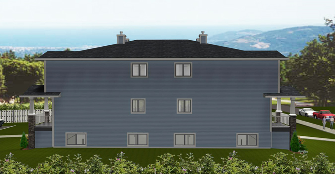 With this 4-Plex design, keeping the construction costs down while not sacrificing any curb appeal is done by making a building simpler to build. You basically only have four corners in this building (except for the cantilever in the master bedroom). This makes every process easier in all phases of construction. The front entry is dropped to minimize the amount of steps to the front door. On the main floor, you have an L-shaped kitchen open to the dining and living room. A 2-piece bath is located next to a pantry or storage closet. There is room for a computer desk beside the stairs. On the second floor there are 2 large bedrooms. The master bedroom features a walk-in closet and a 3-piece ensuite bath. A linen closet is across from the 3-piece main bath. The laundry room is conveniently located on the same floor as the bedrooms. If you need more room, develop the unfinished basement. Basement has 36" high windows allowing natural lighting.