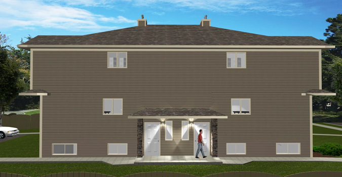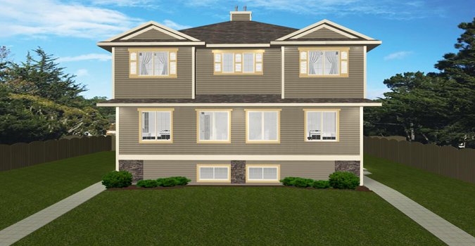 4-Plex with Granny Suites. The main floor of this 4-Plex has a corner kitchen with an island, which is open to the nook and living room. A half bath is located on this floor. The bedrooms are upstairs on the second floor. The master bedroom has a walk-in closet and a 3-piece ensuite. A second 3-piece bathroom for the other bedroom is located right beside the laundry room, which has room for stackable units. The basement is finished for granny suites complete with bedroom, kitchenette and living room. The mechanical room for all units is on the lower level. A stackable washer/dryer is accommodated on this level as well, in the mechanical room. There is storage under the stairs in the basement.