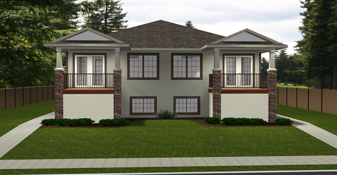 Choose from a couple of floor plans, one with 2 bedrooms and one with 3 bedrooms, and one with laundry on the main floor and one with laundry on the lower floor. The mechanical rooms for all units are on the lower level. Each unit has its own deck and all entrances are from the sides. All kitchen, nook and living room areas are set up the same with a corner pantry and island, and there is a half bath on the main floor in each unit. Two units have a main floor storage room while the other two have main floor laundry. Two different designs on the lower level, one with a two-bedroom layout and laundry room, and the other with a three-bedroom layout. Each has a 3-piece bathroom. A nice looking 4-Plex with stone pillars and covered decks. Great curb appeal.