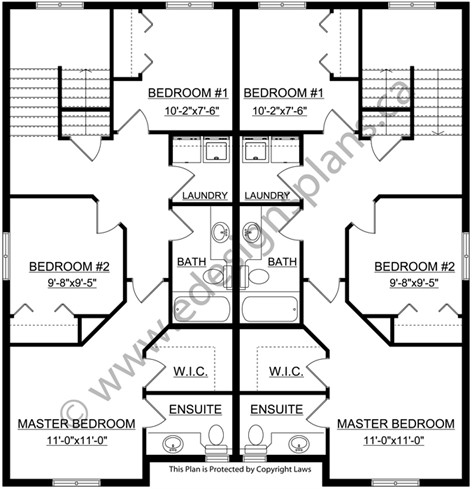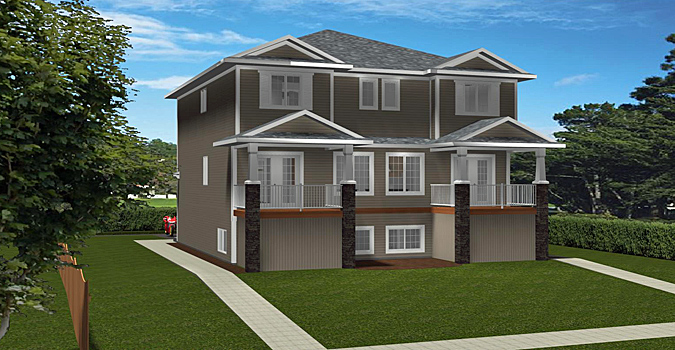 This duplex has separate entrances at the back for the main floor and basement legal suites for added privacy. The main floor has its own mechanical rooms so access to the basement is not necessary for this purpose. This floor plan has the kitchen, nook and living room on the main floor and the bedrooms upstairs. Exit double garden doors from the living room to access the front covered decks. There is a 2-piece bathroom on this level. Upstairs leads you to the laundry and bedroom area. The master bedroom is on the front of the building and has its own walk-in closet and 2-piece ensuite. There are two additional bedrooms on this level along with a 3-piece bathroom. The entrances from the back lead you downstairs to the legal suites. These are set up with two bedrooms, a storage area, and a living room and kitchenette. These units have a 3-piece bathroom and their own mechanical rooms. A great looking plan to gain some additional rental income.