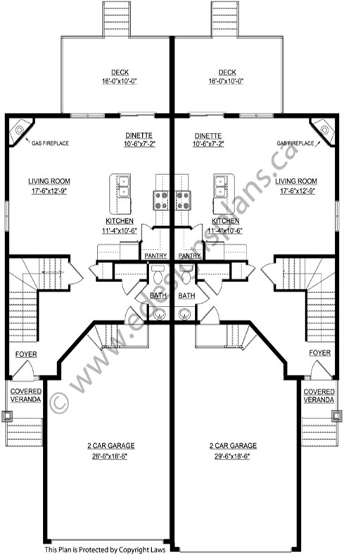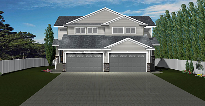 A great looking duplex that would fit well into any residential area. With the roof design, staggered garages, craftsman style post, door with sidelite, and stone trim, there is nice curb appeal. A 2-piece bathroom is right in off the garage or main entrance for convenience. The kitchen, dinette, and living room are open concept with a gas fireplace in the corner to enjoy. Sliding doors off the dinette lead to a rear deck. Upstairs, there are 3 bedrooms in each unit with the right side also having an optional bonus room. Laundry facilities are on this level. The vaulted master bedroom has its own 4-piece ensuite and walk-in closet. The left side has room for a computer desk at the top of the stairs as well. The basement level has one bedroom legal suites which can be accessed separately from side entrances. The utility room is shared with the units above. A great plan for some additional rental income.
