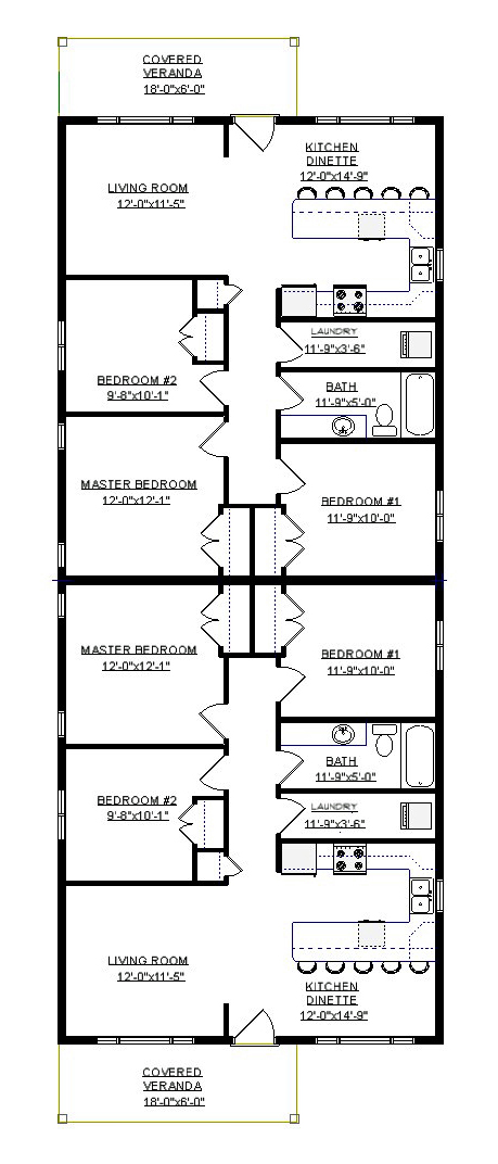 Introducing a single-level front-to-back duplex plan tailored for narrow urban lots. Each unit occupies half the property – one front, one rear – featuring a covered veranda that frames the private entrances. Inside, an open-concept living area flows into an efficient kitchen, ideal for everyday living and entertaining. A central hallway connects a dedicated laundry room, a full bathroom, and three bedrooms, including a master suite, ensuring streamlined circulation. Identical unit layouts simplify construction, reduce costs, and offer consistent style, while separate front and back entrances reinforce independent living and privacy.